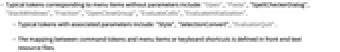 - Typical tokens corresponding to menu items without parameters include: "Open", "Paste", "SpellCheckerDialog", "StackWindows", "Fraction", "OpenCloseGroup", "EvaluateCells", "EvaluateInitialization".