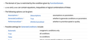 Assumptions $Assumptions assumptions on parameters GenerateConditions True whether to generate conditions on parameters PerformanceGoal $PerformanceGoal whether to prioritize speed or quality - Possible settings for GenerateConditions include: