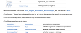 Assumptions $Assumptions assumptions on parameters GenerateConditions True whether to generate conditions on parameters PerformanceGoal $PerformanceGoal whether to prioritize speed or quality StrictInequalities False whether to require a strict sign - Possible settings for GenerateConditions include: