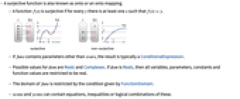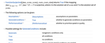 - FunctionSurjective[{funs,xcons,ycons},xvars,yvars,dom] returns True if the mapping