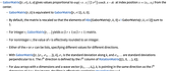 - By default, the matrix is rescaled so that the elements of Abs[GaborMatrix[r,k,0]+I GaborMatrix[r,k,π/2]] sum to 1.