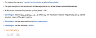 . - GainMargins returns {{ωp1,g1},{ωp2,g2},…}, where ωpi are the phase crossover frequencies, and gi are the absolute values of the gain margins.