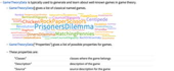 - GameTheoryData["Properties"] gives a list of possible properties for games.