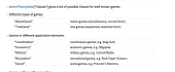 "Classes" classes where the game belongs "Description" description of the game "Source" source description for the game - GameTheoryData["Classes"] gives a list of possible classes for well-known games.