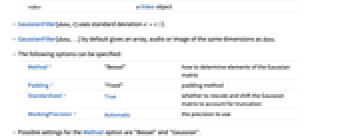 Method "Bessel" how to determine elements of the Gaussian matrix Padding "Fixed" padding method Standardized True whether to rescale and shift the Gaussian matrix to account for truncation WorkingPrecision Automatic the precision to use - Possible settings for the Method option are "Bessel" and "Gaussian".