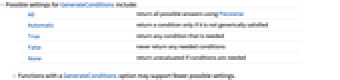 All return all possible answers using Piecewise Automatic return a condition only if it is not generically satisfied True return any condition that is needed False never return any needed conditions None return unevaluated if conditions are needed - Functions with a GenerateConditions option may support fewer possible settings.