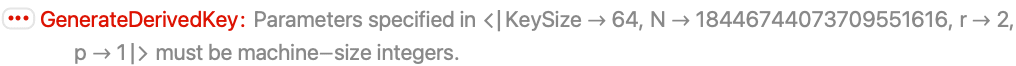 "KeySize" 64 desired key length in bytes "N" 2^15 computational cost factor "r" 8 block size factor "p" 1 parallelization factor - The value of "N" must be an integer power of 2 greater than 1.