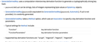 - GenerateDerivedKey takes a Method option, which uses an Association to specify a key derivation function and parameters.