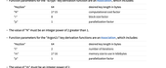 - Function parameters for the "scrypt" key derivation function are an Association, which includes: