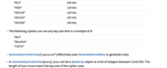 - In GenerateSymmetricKey[bytes], bytes can be a ByteArray object or a list of integers between 0 and 255. The length of bytes must match the key size of the cipher used.