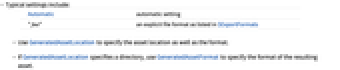 - If GeneratedAssetLocation specifies a directory, use GeneratedAssetFormat to specify the format of the resulting asset.