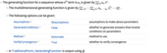 Assumptions $Assumptions assumptions to make about parameters GenerateConditions False whether to generate answers that involve conditions on parameters Method Automatic method to use VerifyConvergence True whether to verify convergence - In TraditionalForm, GeneratingFunction is output using