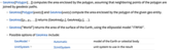 - GeoArea[Polygon[…]] computes the area enclosed by the polygon, assuming that neighboring points of the polygon are joined by geodesic paths.