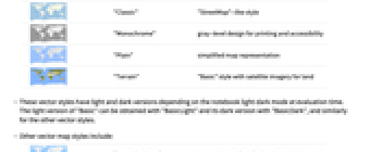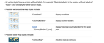"Terrain" "Basic" style with satellite imagery for land - These vector styles have light and dark versions depending on the notebook light-dark mode at evaluation time. The light version of "Basic" can be obtained with "BasicLight" and its dark version with "BasicDark", and similarly for the other vector styles.