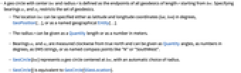 - A geo circle with center loc and radius r is defined as the endpoints of all geodesics of length r starting from loc. Specifying bearings α1 and α2 restricts the set of geodesics.