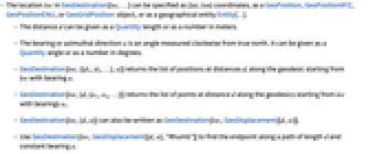 - GeoDestination[loc,{d,α}] can also be written as GeoDestination[loc,GeoDisplacement[{d,α}]].