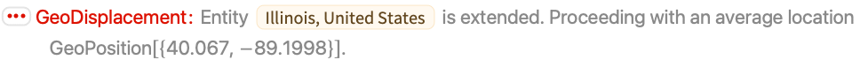 When any of the locations in GeoDisplacement[loc1,loc2] are extended entities, the computation is performed using some average position: