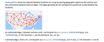 - GeoGraphPlot shows the network between locations on a map by placing geographic objects as the vertices and the connections between them as edges. The edges generally do not correspond to particular routes between the locations.