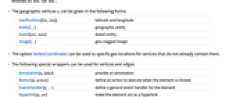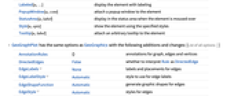 Annotation[a,label] provide an annotation Button[a,action] define an action to execute when the element is clicked EventHandler[a,…] define a general event handler for the element Hyperlink[a,uri] make the element act as a hyperlink Labeled[a,…] display the element with labeling PopupWindow[a,cont] attach a popup window to the element StatusArea[a,label] display in the status area when the element is moused over Style[a,opts] show the element using the specified styles Tooltip[a,label] attach an arbitrary tooltip to the element - GeoGraphPlot has the same options as GeoGraphics with the following additions and changes: [List of all options]