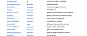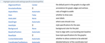 AlignmentPoint Center the default point in the graphic to align with AnnotationRules {} annotations for graph, edges and vertices AspectRatio Automatic ratio of height to width Axes False whether to draw axes AxesLabel None axes labels AxesOrigin Automatic where axes should cross AxesStyle {} style specifications for the axes Background None background color for the plot BaselinePosition Automatic how to align with a surrounding text baseline BaseStyle {} base style specifications for the graphic ContentSelectable Automatic whether to allow contents to be selected CoordinatesToolOptions Automatic detailed behavior of the coordinates tool DirectedEdges False whether to interpret Rule as DirectedEdge EdgeLabels None labels and placements for edges EdgeLabelStyle Automatic style to use for edge labels EdgeShapeFunction Automatic generate graphic shapes for edges EdgeStyle Automatic styles for edges Epilog {} primitives rendered after the main plot FormatType TraditionalForm the default format type for text Frame False whether to put a frame around the plot FrameLabel None frame labels FrameStyle {} style specifications for the frame FrameTicks Automatic frame ticks FrameTicksStyle {} style specifications for frame ticks GeoBackground Automatic style specifications for the background GeoCenter Automatic center coordinates to use GeoGridLines None geographic grid lines to draw GeoGridLinesStyle Automatic style specifications for geographic grid lines GeoGridRange All projected coordinate range to include GeoGridRangePadding Automatic how much to pad the projected range GeoModel Automatic model of the Earth (or other body) to use GeoProjection Automatic projection to use GeoRange Automatic geographic area range to include GeoRangePadding Automatic how much to pad the geographic range GeoResolution Automatic average distance between background pixels GeoScaleBar None scale bar to display GeoServer Automatic specification of a tile server GeoZoomLevel Automatic zoom to use for geographic background GraphHighlight {} vertices and edges to highlight GraphHighlightStyle Automatic style for highlight GraphLayout Automatic how to layout graph elements GridLines None grid lines to draw GridLinesStyle {} style specifications for grid lines ImageMargins 0. the margins to leave around the graphic ImagePadding All what extra padding to allow for labels etc. ImageSize Automatic the absolute size at which to render the graphic LabelStyle {} style specifications for labels MetaInformation {} meta-information about the map Method Automatic method to use PerformanceGoal Automatic aspects of performance to try to optimize PlotLabel None an overall label for the plot PlotRange All range of values to include PlotRangeClipping False whether to clip at the plot range PlotRangePadding Automatic how much to pad the range of values PlotRegion Automatic the final display region to be filled PlotStyle Automatic graphics directives to determine styles PlotTheme Automatic overall theme for the graph PreserveImageOptions Automatic whether to preserve image options when displaying new versions of the same graphic Prolog {} primitives rendered before the main plot RasterSize Automatic raster dimensions for the background data RotateLabel True whether to rotate y labels on the frame Ticks Automatic axes ticks TicksStyle {} style specifications for axes ticks VertexCoordinates Automatic coordinates for vertices VertexLabels None labels and placements for vertices VertexLabelStyle Automatic style to use for vertex labels VertexShape Automatic graphic shape for vertices VertexShapeFunction Automatic generate graphic shapes for vertices VertexSize Automatic size of vertices VertexStyle Automatic styles for vertices