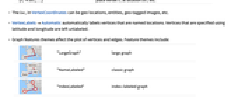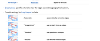 AnnotationRules {} annotations for graph, edges and vertices DirectedEdges False whether to interpret Rule as DirectedEdge EdgeLabels None labels and placements for edges EdgeLabelStyle Automatic style to use for edge labels EdgeShapeFunction Automatic generate graphic shapes for edges EdgeStyle Automatic styles for edges GraphHighlight {} vertices and edges to highlight GraphHighlightStyle Automatic style for highlight GraphLayout Automatic how to layout graph elements Method Automatic method to use PerformanceGoal Automatic aspects of performance to try to optimize PlotStyle Automatic graphics directives to determine styles PlotTheme Automatic overall theme for the graph VertexCoordinates Automatic coordinates for vertices VertexLabels None labels and placements for vertices VertexLabelStyle Automatic style to use for vertex labels VertexShape Automatic graphic shape for vertices VertexShapeFunction Automatic generate graphic shapes for vertices VertexSize Automatic size of vertices VertexStyle Automatic styles for vertices - GraphLayout specifies where to draw the edges connecting geographic locations.