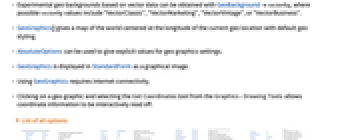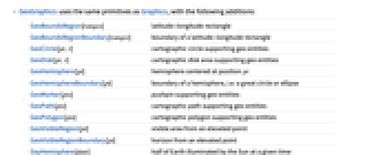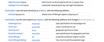 GeoBoundsRegion[ranges] latitude-longitude rectangle GeoBoundsRegionBoundary[ranges] boundary of a latitude-longitude rectangle GeoCircle[pt,r] cartographic circle supporting geo entities GeoDisk[pt,r] cartographic disk area supporting geo entities GeoHemisphere[pt] hemisphere centered at position pt GeoHemisphereBoundary[pt] boundary of a hemisphere, i.e. a great circle or ellipse GeoMarker[pts] pushpin supporting geo entities GeoPath[pts] cartographic path supporting geo entities GeoPolygon[pts] cartographic polygon supporting geo entities GeoVisibleRegion[pt] visible area from an elevated point GeoVisibleRegionBoundary[pt] horizon from an elevated point DayHemisphere[date] half of Earth illuminated by the Sun at a given time NightHemisphere[date] half of Earth not illuminated by the Sun at a given time DayNightTerminator[date] closed path separating the day and night hemispheres - GeoGraphics uses the same directives as Graphics, with the following addition: