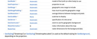 GeoBackground Automatic style specifications for the background GeoCenter Automatic center coordinates to use GeoGridLines None geographic grid lines to draw GeoGridLinesStyle Automatic style specifications for geographic grid lines GeoGridRange All projected coordinate range to include GeoGridRangePadding Automatic how much to pad the projected range GeoModel Automatic model of the Earth (or other body) to use GeoProjection Automatic projection to use GeoRange Automatic geographic area range to include GeoRangePadding Automatic how much to pad the geographic range GeoResolution Automatic average distance between background pixels GeoScaleBar None scale bar to display GeoServer Automatic specification of a tile server GeoZoomLevel Automatic zoom to use for geographic background MetaInformation {} meta-information about the map RasterSize Automatic raster dimensions for the background data - GeoGraphics can use vector backgrounds like "Terrain", "Plain" or "Classic", and also raster backgrounds like "StreetMap", "Satellite" or "ReliefMap". The default geo background is "Terrain".