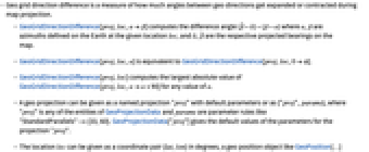 - GeoGridDirectionDifference[proj,loc] computes the largest absolute value of GeoGridDirectionDifference[proj,loc,αα+90] for any value of α.