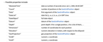 "AbsoluteTime" date as number of seconds since Jan 1, 1900, 00:00 GMT "Count" number of positions in the GeoGridPosition object "Data" first argument of the GeoGridPosition object "DateList" date list {y,m,d,h,m,s} in GMT time "DateObject" full date object "Datum" datum of the GeoGridPosition object "Depth" point depth: 0 for a single position, 1 for a list of them, … "Dimension" number of coordinates for each position "Elevation" numeric elevation in meters, with respect to the ellipsoid "GeoProjection" geo projection of the GeoGridPosition object "GridX" numeric x coordinate "GridY" numeric y coordinate "GridXY" numeric {x,y} pair "PackingType" Integer or Real if data is packed; None otherwise