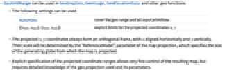 Automatic cover the geo range and all input primitives {{xmin,xmax},{ymin,ymax}} explicit limits for the projected coordinates x,y - The projected x,y coordinates always form an orthogonal frame, with x aligned horizontally and y vertically. Their scale will be determined by the "ReferenceModel" parameter of the map projection, which specifies the size of the generating globe from which the map is projected.