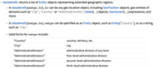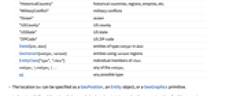 "Country" country, territory, etc. "City" city "AdministrativeDivision" administrative division of any level "AdministrativeDivision1" first-level administrative division "AdministrativeDivision2" second-level administrative division "AdministrativeDivision3" third-level administrative division "HistoricalCountry" historical countries, regions, empires, etc. "MilitaryConflict" military conflicts "Ocean" ocean "USCounty" US county "USState" US state "ZIPCode" US ZIP code Dated[ent,date] entities of type enttype in date GeoVariant[enttype,variant] entities using variant regions EntityClass["type","class"] individual members of class enttype1|enttype2|… any of the enttypei All any possible type - The location loc can be specified as a GeoPosition, an Entity object, or a GeoGraphics primitive.