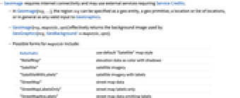 Automatic use default "Satellite" map style "ReliefMap" elevation data as color with shadows "Satellite" satellite imagery "SatelliteWithLabels" satellite imagery with labels "StreetMap" street map data "StreetMapLabelsOnly" street map labels only "StreetMapNoLabels" street map data omitting labels - Options of GeoImage include: