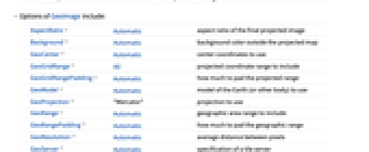 AspectRatio Automatic aspect ratio of the final projected image Background Automatic background color outside the projected map GeoCenter Automatic center coordinates to use GeoGridRange All projected coordinate range to include GeoGridRangePadding Automatic how much to pad the projected range GeoModel Automatic model of the Earth (or other body) to use GeoProjection "Mercator" projection to use GeoRange Automatic geographic area range to include GeoRangePadding Automatic how much to pad the geographic range GeoResolution Automatic average distance between pixels GeoServer Automatic specification of a tile server GeoZoomLevel Automatic zoom to use for tile download ImageSize Automatic image size of result MetaInformation {} additional fields of metainformation RasterSize Automatic raster dimensions for the underlying data - GeoImage[] gives a satellite image centered on the current geo location.