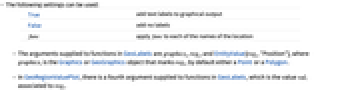 True add text labels to graphical output False add no labels func apply func to each of the names of the location - The arguments supplied to functions in GeoLabels are graphicsi, regi, and EntityValue[regi,"Position"], where graphicsi is the Graphics or GeoGraphics object that marks regi, by default either a Point or a Polygon.