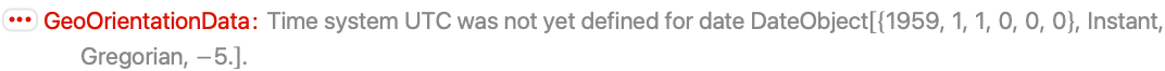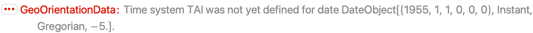 - In GeoOrientationData[date,…], date specifications are DateObject or DateInterval expressions representing dates or intervals. The TimeSystem option of DateObject allows specifying time systems such as "UT1" or "TT", with default "UTC".