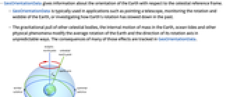 - GeoOrientationData is typically used in applications such as pointing a telescope, monitoring the rotation and wobble of the Earth, or investigating how Earth's rotation has slowed down in the past.