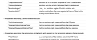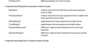"BiasMatrix" rotation matrix from the ICRS frame to the mean equatorial frame of J2000 "PrecessionMatrix" rotation matrix from the mean equatorial frame of J2000 to the mean equatorial frame of date "MeanObliquity" angle between the mean equatorial and ecliptic planes "TrueObliquity" angle between the true equatorial and ecliptic planes "EquationOfEquinoxes" difference in right ascension between the true and mean equinoxes "EquationOfOrigins" difference in right ascension betwen the true equinox and the CIO point - Properties describing Earth's nutation motion include: