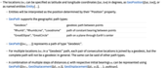 "Geodesic" geodesic path between points "Rhumb","RhumbLine","Loxodrome" path of constant bearing between points "GreatEllipse","GreatCircle" path on a plane through Earth's center - GeoPath[{loc1,…}] represents a path of type "Geodesic".