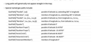 GeoPath[{"Parallel",lat}] parallel of latitude lat, extending 360° in longitude GeoPath[{"Meridian",lon}] meridian of longitude lon, extending 180° in latitude GeoPath[{"Parallel",lat,{lon1,lon2}}] parallel of latitude lat, from longitude lon1 to lon2 GeoPath[{"Meridian",lon,{lat1,lat2}}] meridian of longitude lon, from latitude lat1 to lat2 GeoPath["Equator"] parallel of latitude 0° GeoPath["NorthernTropic"] parallel of latitude 23.43703° GeoPath["SouthernTropic"] parallel of latitude -23.43703° GeoPath["ArcticCircle"] parallel of latitude 66.56297° GeoPath["AntarcticCircle"] parallel of latitude -66.56297° GeoPath["GreenwichMeridian"] meridian of longitude 0° GeoPath["DateLineMeridian"] meridian of longitude 180° GeoPath["DateLine"] international date line - Line thickness can be specified using Thickness or AbsoluteThickness, as well as Thick and Thin.