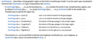 GeoPolygon[locs{intloc}] intloc is an interior location to the geo polygon GeoPolygon[locs,extloc] extloc is an exterior location to the geo polygon GeoPolygon[locs,"SmallerArea"] the interior of the geo polygon is the smaller region GeoPolygon[locs,"LargerArea"] the interior of the geo polygon is the larger region GeoPolygon[locs,"LeftArea"] the interior is to the left as locs are traversed GeoPolygon[locs,"RightArea"] the interior is to the right as locs are traversed - The locations loci can be specified as latitude and longitude coordinates {lat,lon} in degrees, as GeoPosition[{lat,lon}] or as named entities Entity[…].