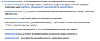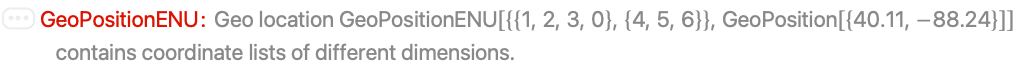 - In GeoPositionENU[enu,p], the origin position p can be given as a geo Entity object or any form of geodetic position with head GeoPosition, GeoPositionXYZ, GeoPositionENU or GeoGridPosition.