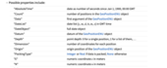 "AbsoluteTime" date as number of seconds since Jan 1, 1900, 00:00 GMT "Count" number of positions in the GeoPositionENU object "Data" first argument of the GeoPositionENU object "DateList" date list {y,m,d,h,m,s} in GMT time "DateObject" full date object "Datum" datum of the GeoPositionENU object "Depth" point depth: 0 for a single position, 1 for a list of them, … "Dimension" number of coordinates for each position "Origin" origin position of the GeoPositionENU object "PackingType" Integer or Real if data is packed; None otherwise "E" numeric coordinate e in meters "N" numeric coordinate n in meters "U" numeric coordinate u in meters "ENU" numeric {e,n,u} triple in meters "NEU" numeric {n,e,u} triple in meters "EN" numeric {e,n} pair in meters "NE" numeric {n,e} pair in meters "EU" numeric {e,u} pair in meters "NU" numeric {n,u} pair in meters