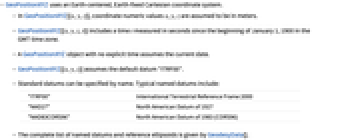 - GeoPositionXYZ[{x,y,z}] assumes the default datum "ITRF00".