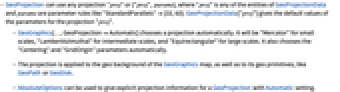 - GeoProjection can use any projection "proj" or {"proj",params}, where "proj" is any of the entities of GeoProjectionData and params are parameter rules like "StandardParallels"{33,60}. GeoProjectionData["proj"] gives the default values of the parameters for the projection "proj".