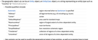 - The geographic object obj can be an Entity object, an EntityClass object, or a string representing an entity type such as "Country" or "HistoricalCountry".