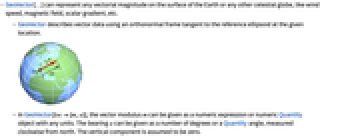 - GeoVector[…] can represent any vectorial magnitude on the surface of the Earth or any other celestial globe, like wind speed, magnetic field, scalar gradient, etc.