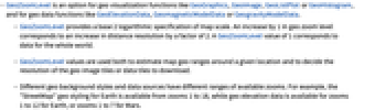- GeoZoomLevel is an option for geo visualization functions like GeoGraphics, GeoImage, GeoListPlot or GeoHistogram, and for geo data functions like GeoElevationData, GeomagneticModelData or GeogravityModelData.