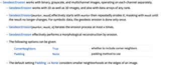 - GeodesicErosion works with binary, grayscale, and multichannel images, operating on each channel separately.
