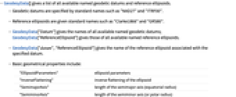- GeodesyData[] gives a list of all available named geodetic datums and reference ellipsoids.