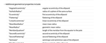 "AngularEccentricity" angular eccentricity of the ellipsoid "AuthalicRadius" radius of a sphere of the same surface "Eccentricity" first eccentricity of the ellipsoid "Flattening" flattening of the ellipsoid "LinearEccentricity" linear eccentricity of the ellipsoid "MeanMassRadius" mean mass radius "MeanRadius" geometric mean radius "MeridianQuadrant" length of the meridian from the equator to the pole "SecondEccentricity" second eccentricity of the ellipsoid "SecondFlattening" second flattening of the ellipsoid "Semiaxes" semimajor and semiminor axes of the ellipsoid "ThirdEccentricity" third eccentricity of the ellipsoid "ThirdFlattening" third flattening of the ellipsoid "VolumetricRadius" radius of a sphere of equal volume - Coordinate-dependent properties include: